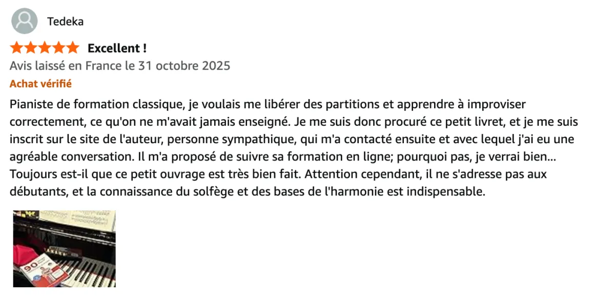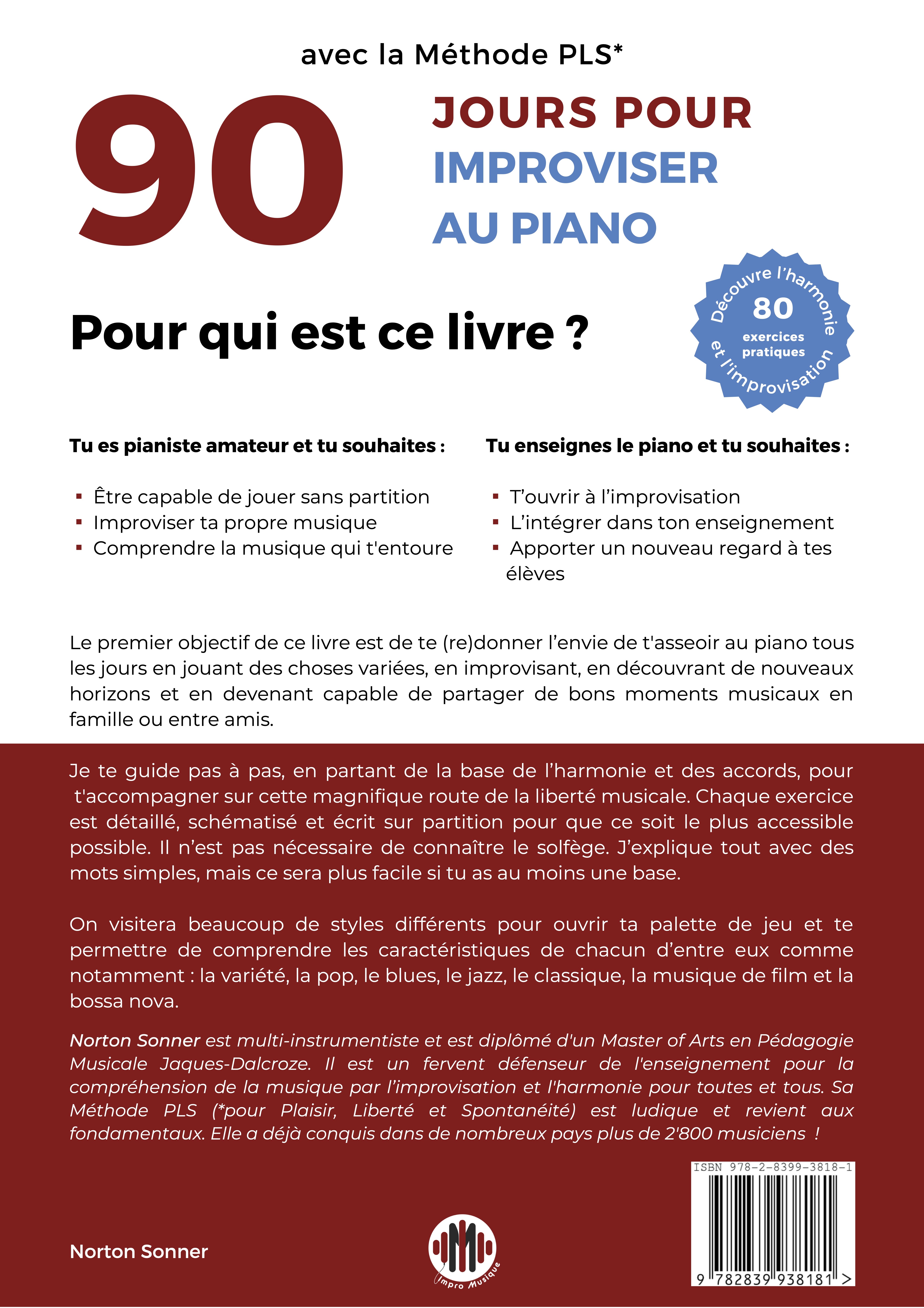 Avec mon livre "90 Jours pour Improviser au Piano", je t’accompagne pas à pas pendant 12 semaines (ou à ton propre rythme) pour transformer ton jeu au piano grâce à une méthode claire, ludique et progressive.